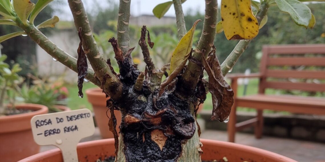 Quando o solo permanece molhado por longos períodos, a planta não consegue “respirar”. As raízes ficam saturadas, perdem oxigenação e começam a apodrecer. Esse processo nem sempre é imediato, o que torna o erro na rega no cultivo da rosa do deserto ainda mais perigoso, pois os sinais aparecem quando o dano já está avançado.