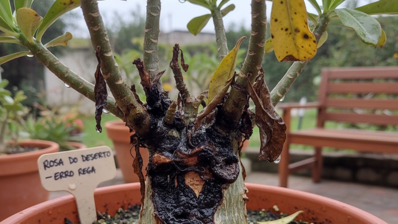 Quando o solo permanece molhado por longos períodos, a planta não consegue “respirar”. As raízes ficam saturadas, perdem oxigenação e começam a apodrecer. Esse processo nem sempre é imediato, o que torna o erro na rega no cultivo da rosa do deserto ainda mais perigoso, pois os sinais aparecem quando o dano já está avançado.