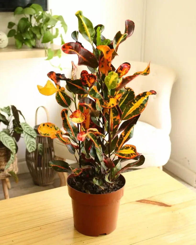 Dentro de casa, o cróton se adapta melhor quando está próximo a janelas amplas, varandas envidraçadas ou áreas onde a luz circule livremente. Assim, a planta mantém seu caráter ornamental e se destaca como ponto focal na decoração.
